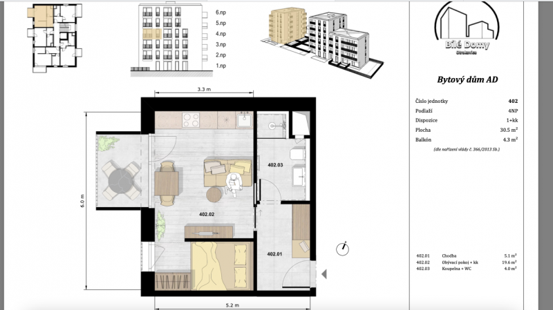 Nabízíme Vám k pronájmu bytovou jednotku 1+kk v novostavbě o velikosti 30,5 m² s balkonem o velikosti 4,3 m².